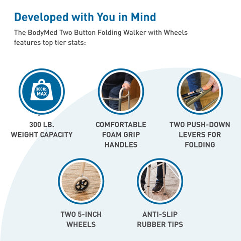 The BodyMed® is a high-quality, lightweight folding walker. Designed to help users stay mobile, this walker is easy to use and fold with its two-button design. The two-button design allows each side to fold in independently. This walker is made with an aluminum frame and includes rubber feet on the back legs. Available with 5-in. front wheels. Country of Origin: China