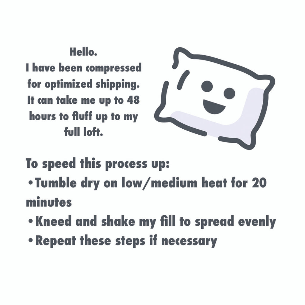 Please Note. The pillow is compressed for optimized shipping. It can take up to 48 hours to fluff up to the full loft. To speed this process up: Tumble dry on low/medium heat for 20 minutes, kneed and shake the fill to spread evenly, and repeat these steps if necessary.