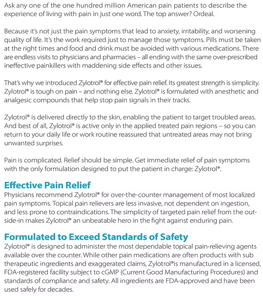 Zylotrol™ has been formulated with proven over the counter  (“OTC”) analgesics that have been shown to deliver long-lasting relief for pain associated with sprains, strains, arthritis, and pain resulting from a workplace or automotive injury.